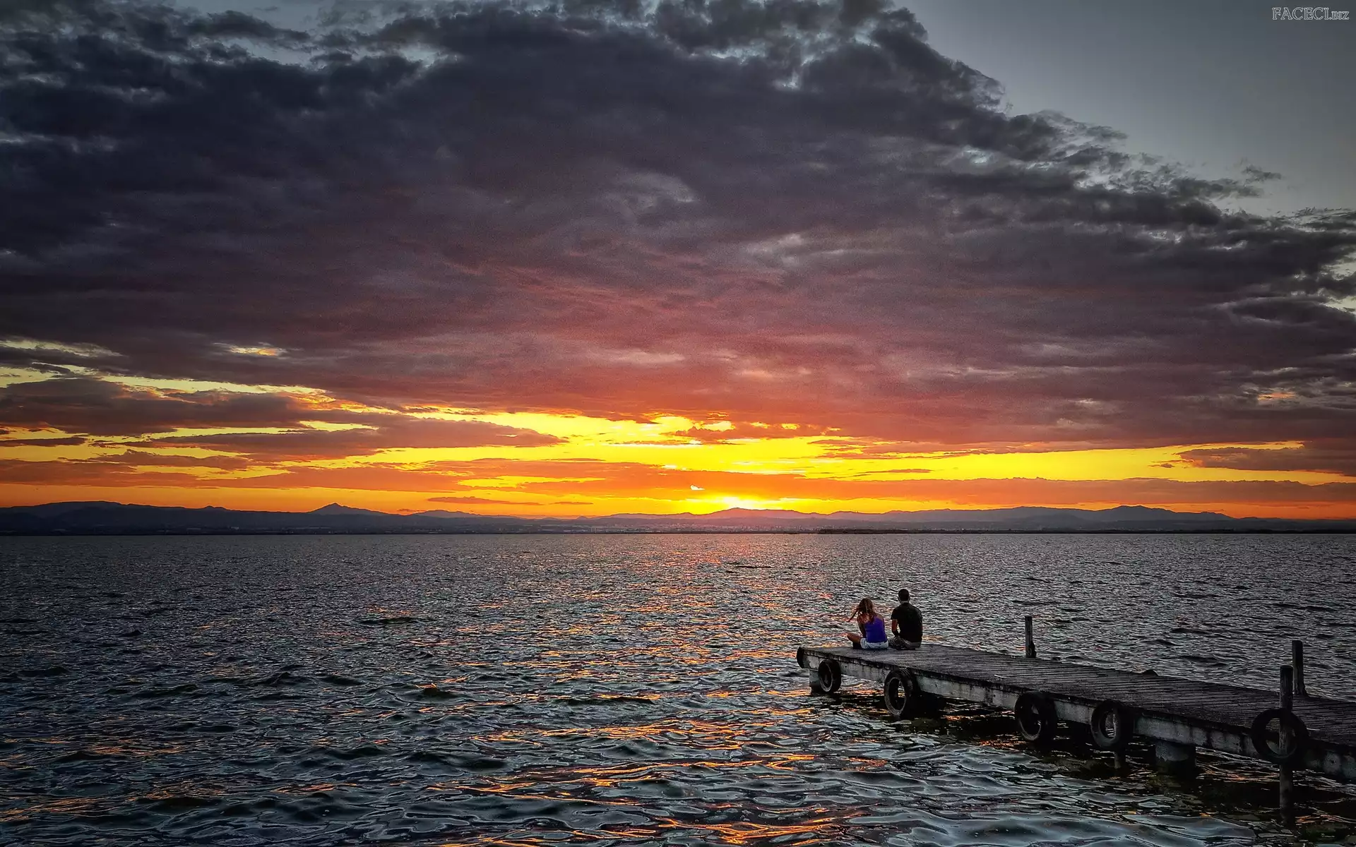 Słońca, Mężczyzna, Jezioro, Zachód, Chmury, Kobieta, Molo, Góry - faceci.biz